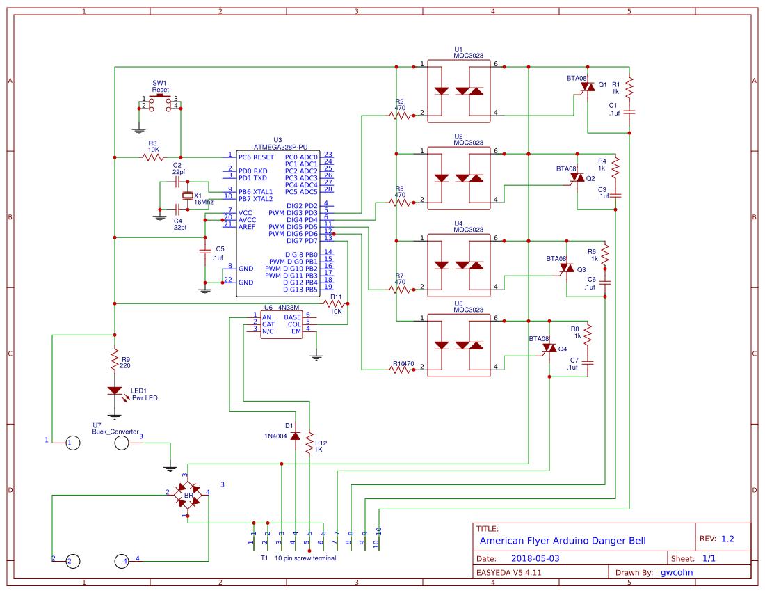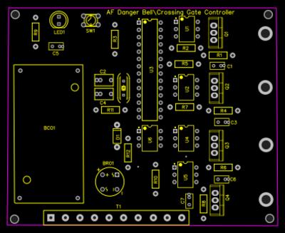 These in turn trigger the larger triacs which switch the 16 volts AC on and off for the lights, bell, and crossing gate. The resistor and capacitor across each triac provides a "snubber" network. When driving inductive loads such as the coil in the bell and crossing gates, they may generate a spike of voltage when turned off and the snubber networks keep that from retriggering the triac before intended.