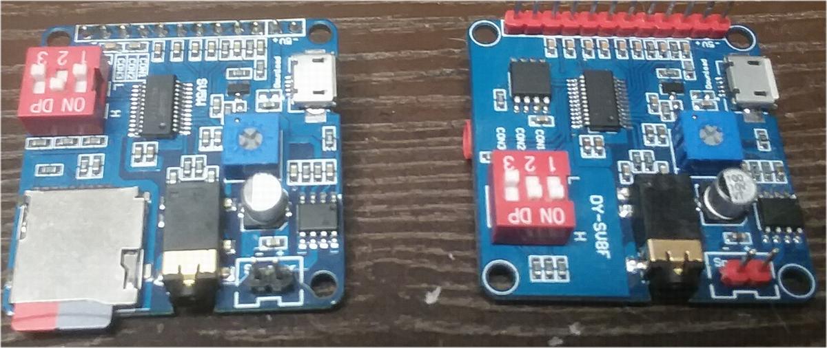 These are pictures of the appropriate sound cards. The left one uses a sd card to store sound files and the right one has a built in ROM to store the sound files. The wire from pin 4 on the Atmega 328 chip acts as a pushbutton to select the appropriate bell sound. They have a built-in 5 watt amplifier so they can drive a speaker directly.